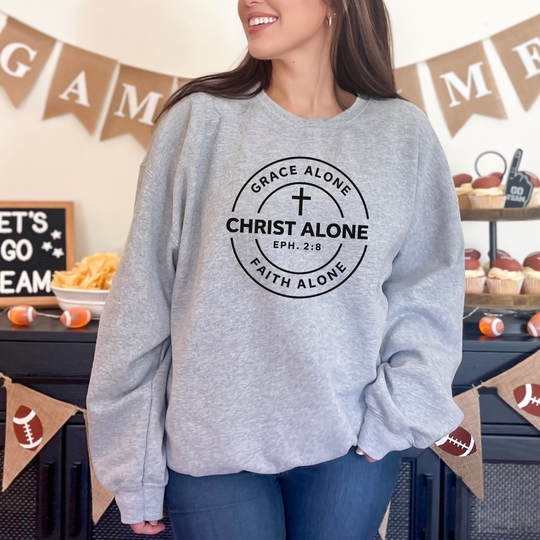 Bold in faith and timeless in style š¤ This āGrace Alone ⢠Christ Alone ⢠Faith Aloneā sweatshirt features a clean, circular design inspired by Ephesians 2:8, making it a meaningful everyday staple.