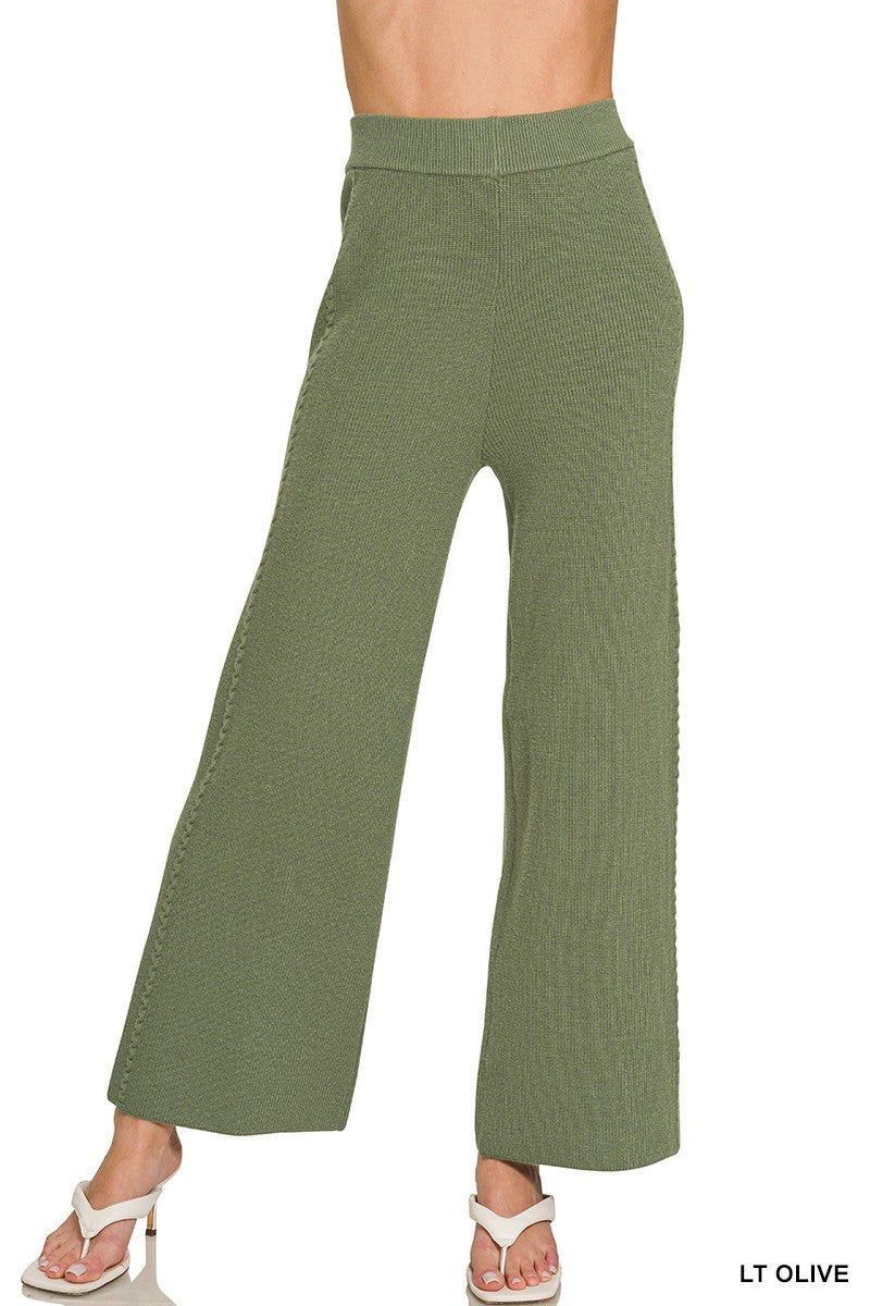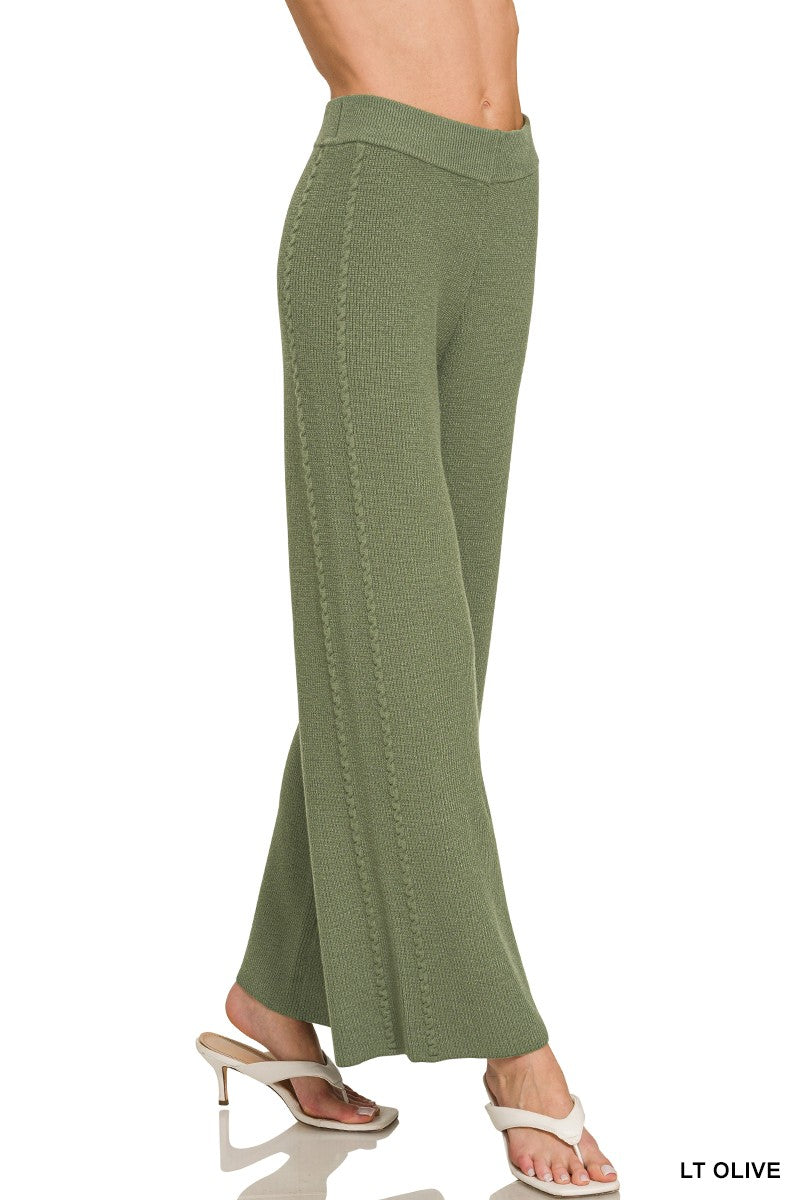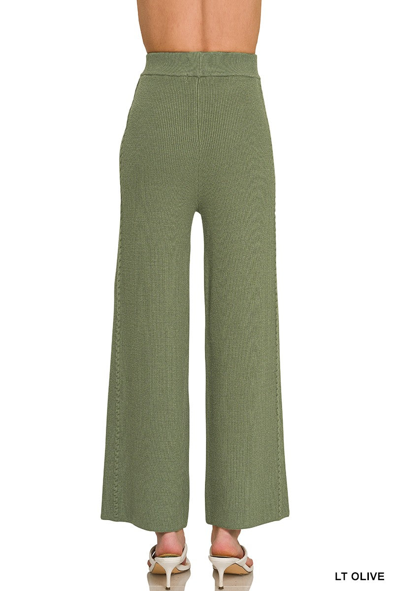 These sweater pants offer a relaxed fit and wide leg design, perfect for comfortable and stylish wear. Crafted from soft knit fabric with an elastic waistband, they provide all-day comfort. The versatile style makes them suitable for various occasions, while the breathable material ensures a pleasant experience. Easy to care for, these pants are a must-have addition to your wardrobe. The light olive color adds a touch of sophistication.