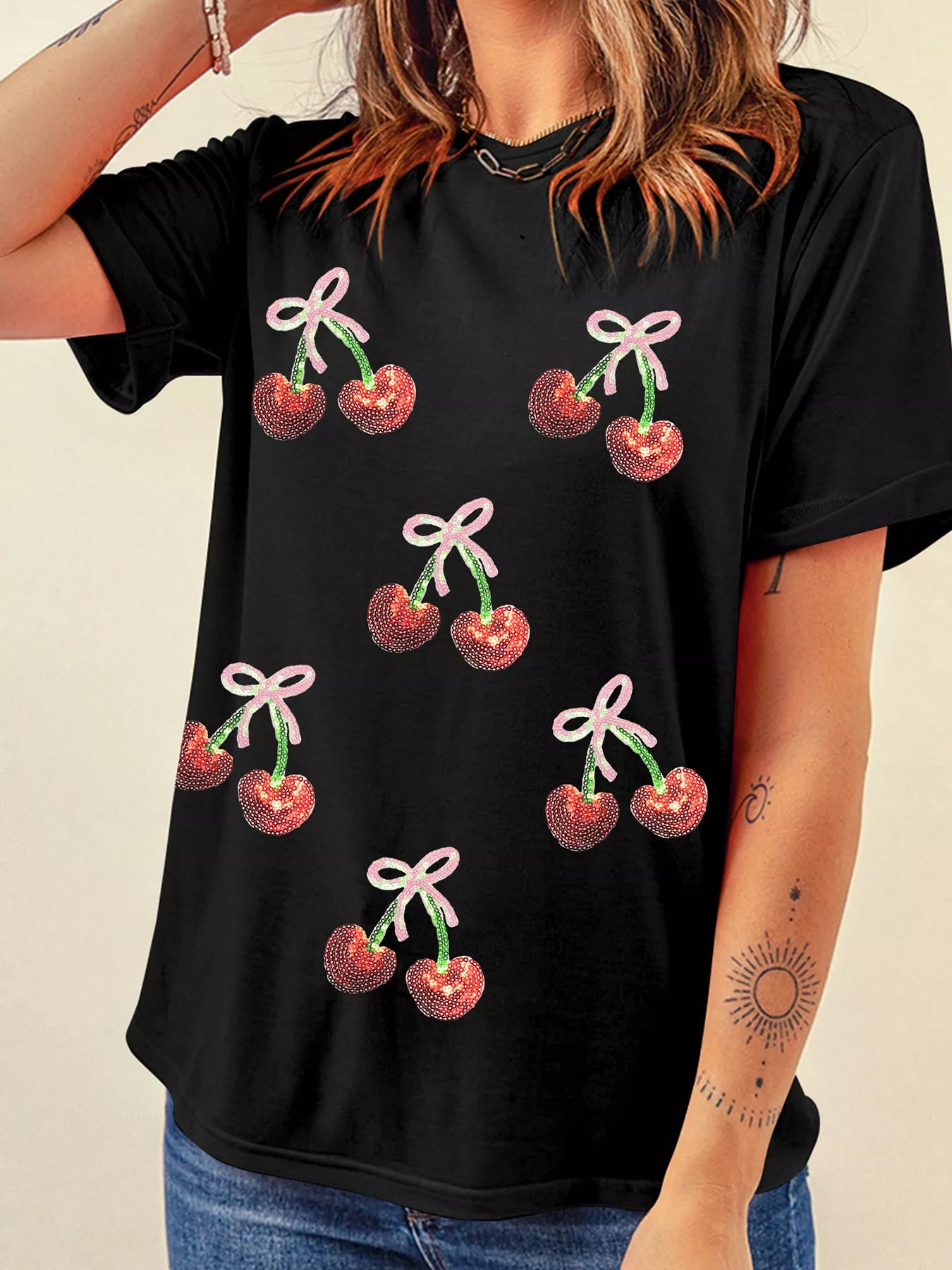 Full Size Sequin Bow Cheery Patched Valentines Tee Plus Size